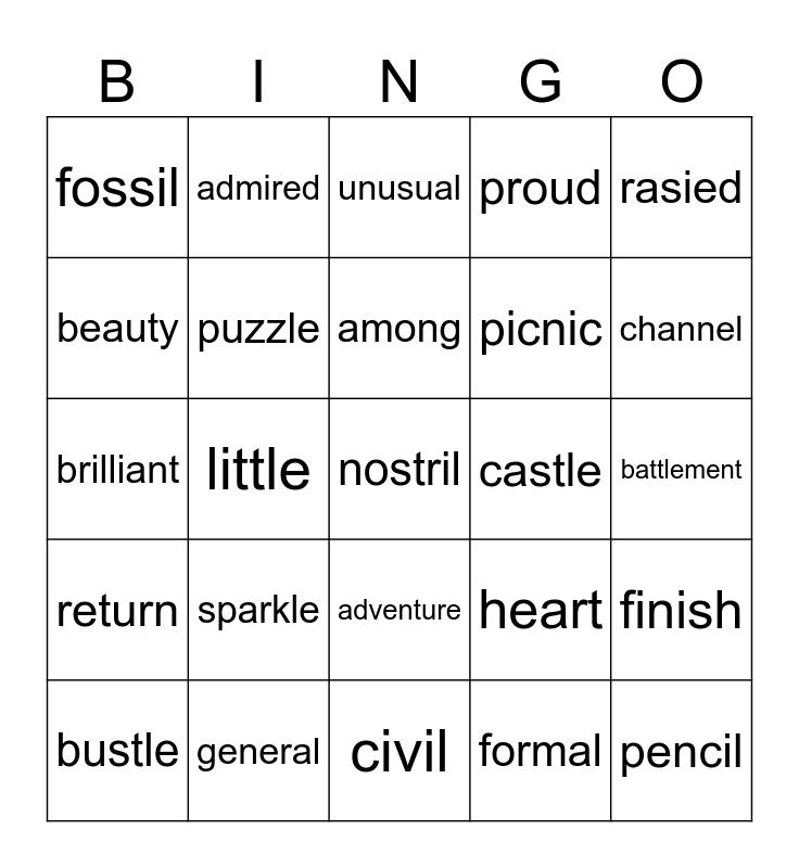 This bingo card has a free space and 29 words: bustle, gentle, little, poodle, fossil, unusual, puzzle, sparkle, castle, general, battlement, pencil, civil, formal, channel, struck, adventure, return, rasied, brilliant, heart, money, picnic, beauty, proud, admired, finish, among and woman.