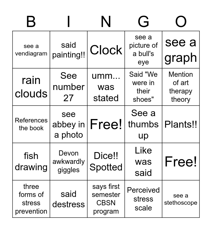 This bingo card has a free space and 24 words: Devon awkwardly giggles, said destress, umm... was stated, three forms of stress prevention, see a graph, see a vendiagram, rain clouds, said painting!!, See a thumbs up, Dice!! Spotted, Said "We were in their shoes", References the book, Like was said, Free!, See number 27, Perceived stress scale, Plants!!, Clock, Mention of art therapy theory, see abbey in a photo, see a stethoscope, fish drawing, see a picture of a bull's eye and says first semester CBSN program.