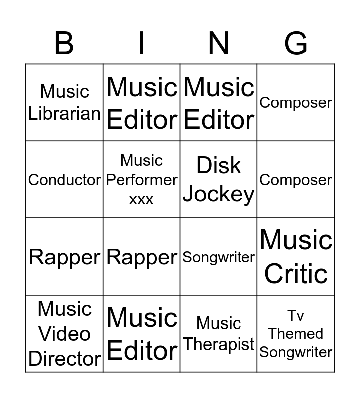 This bingo card has a free space and 15 words: Music Video Director, Tv Themed Songwriter, Music Editor, Music Librarian, Composer, Conductor, Rapper, Music Therapist, Music Performer xxx, Rapper, Music Critic, Composer, Disk Jockey, Music Editor and Music Editor.