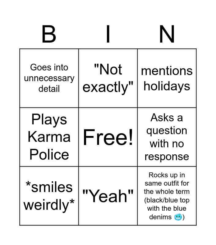 This bingo card has a free space and 11 words: Claps hands together, "Yeah", Rocks up in same outfit for the whole term (black/blue top with the blue denims 🥶), *smiles weirdly*, "Not exactly", mentions holidays, Asks a question with no response, someone asks a question that was already answered (literally 2 secs ago), Plays Karma Police, Goes into unnecessary detail and Jamie falls asleep.