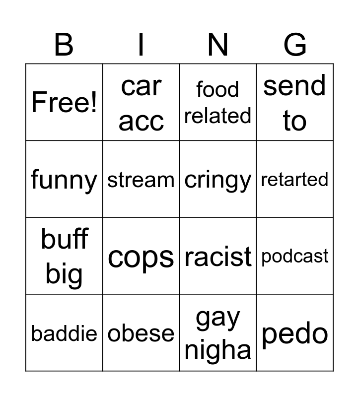 This bingo card has 16 words: baddie, obese, food related, send to, funny, car acc, racist, podcast, Free!, stream, gay nigha, retarted, buff big, cops, cringy and pedo.