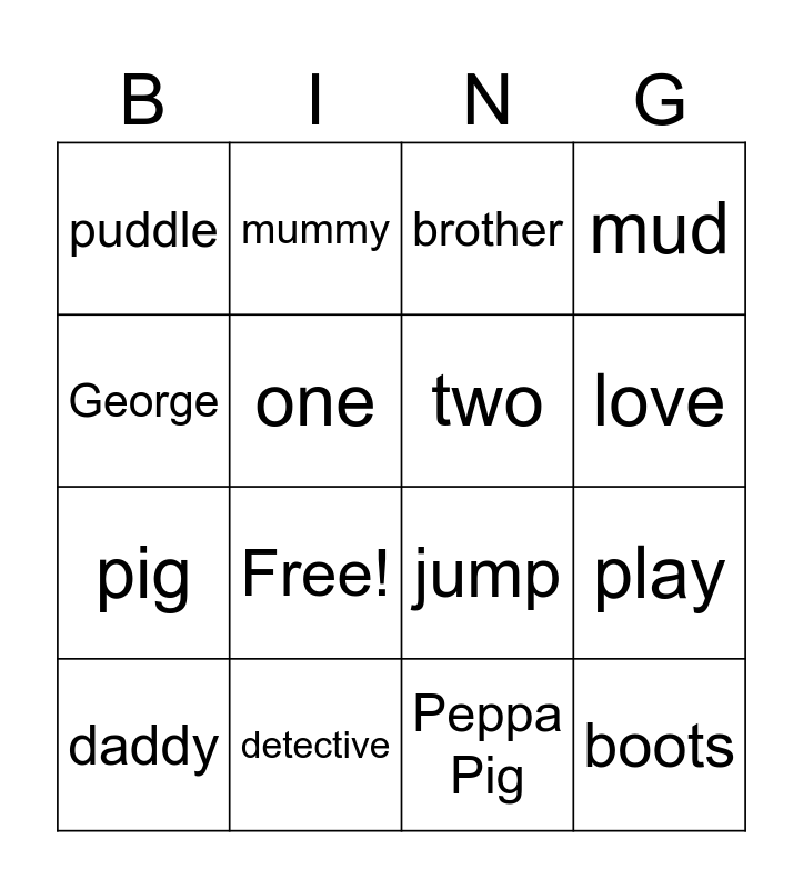 This bingo card has 18 words: Free!, boots, brother, puddle, jump, mud, daddy, mummy, love, pig, Peppa Pig, George, play, one, two, Dinosaur, detective and happy.