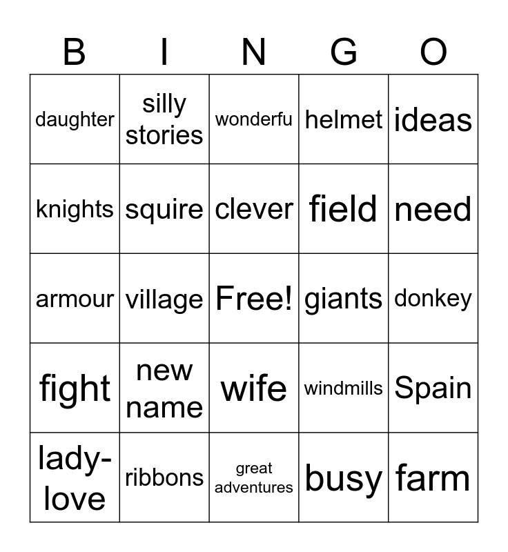 This bingo card has a free space and 28 words: Spain, niece, field, busy, knights, wonderfu, silly stories, fight, giants, lady-love, armour, helmet, ribbons, great adventures, need, horse, new name, squire, clever, wife, daughter, rich, farm, village, donkey, windmills, ideas and leave.
