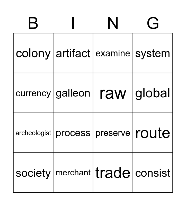 This bingo card has 16 words: merchant, route, examine, colony, archeologist, artifact, preserve, trade, currency, galleon, society, system, process, global, raw and consist.