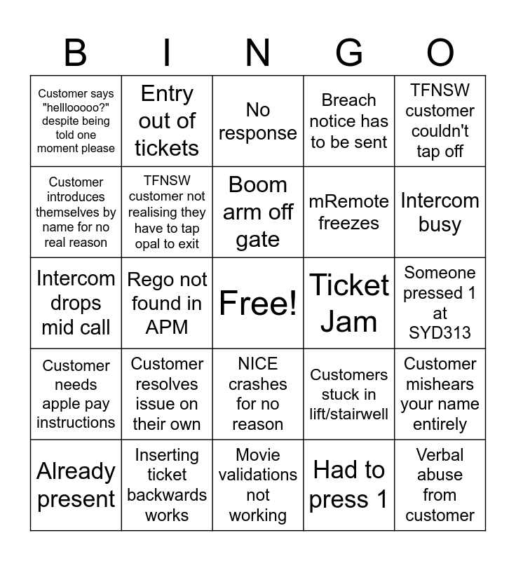 This bingo card has a free space and 24 words: Customer resolves issue on their own, Inserting ticket backwards works, Boom arm off gate, Already present, TFNSW customer couldn't tap off, Customer says "helllooooo?" despite being told one moment please, Customer introduces themselves by name for no real reason, Entry out of tickets, Ticket Jam, NICE crashes for no reason, mRemote freezes, Intercom drops mid call, Customers stuck in lift/stairwell, Customer mishears your name entirely, TFNSW customer not realising they have to tap opal to exit, Had to press 1, Someone pressed 1 at SYD313, No response, Intercom busy, Rego not found in APM, Verbal abuse from customer, Customer needs apple pay instructions, Breach notice has to be sent and Movie validations not working.