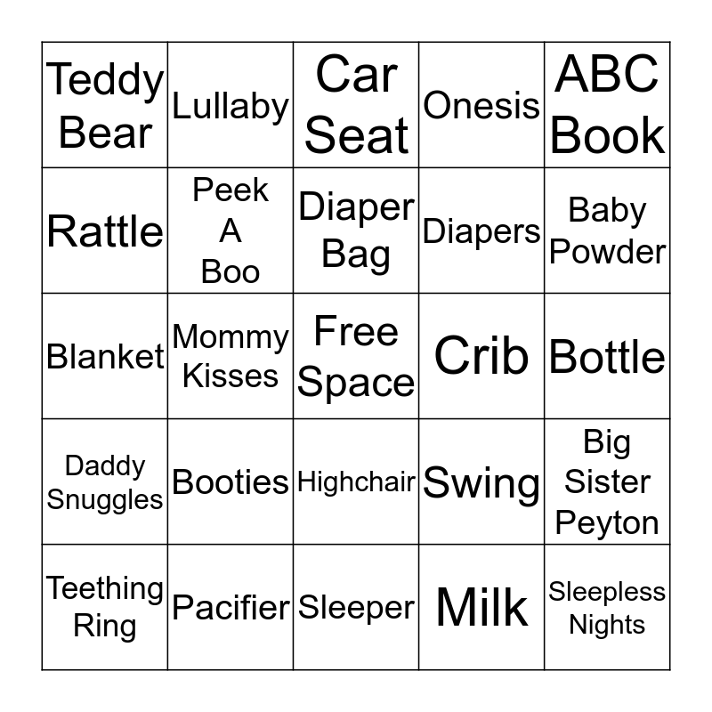 This bingo card has a free space and 24 words: Booties, Pacifier, Diaper Bag, Teething Ring, ABC Book, Teddy Bear, Rattle, Lullaby, Crib, Highchair, Diapers, Blanket, Swing, Big Sister Peyton, Peek A Boo, Milk, Bottle, Car Seat, Baby Powder, Mommy Kisses, Sleepless Nights, Daddy Snuggles, Onesis and Sleeper.