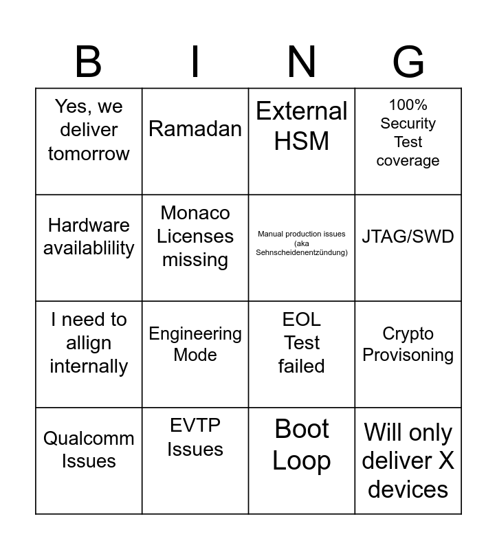 This bingo card has 16 words: EVTP Issues, Crypto Provisoning, External HSM, Yes, we deliver tomorrow, I need to allign internally, Ramadan, EOL Test failed, Boot Loop, Hardware availablility, Monaco Licenses missing, Qualcomm Issues, 100% Security Test coverage, Engineering Mode, JTAG/SWD, Manual production issues (aka Sehnscheidenentzündung) and Will only deliver X devices.