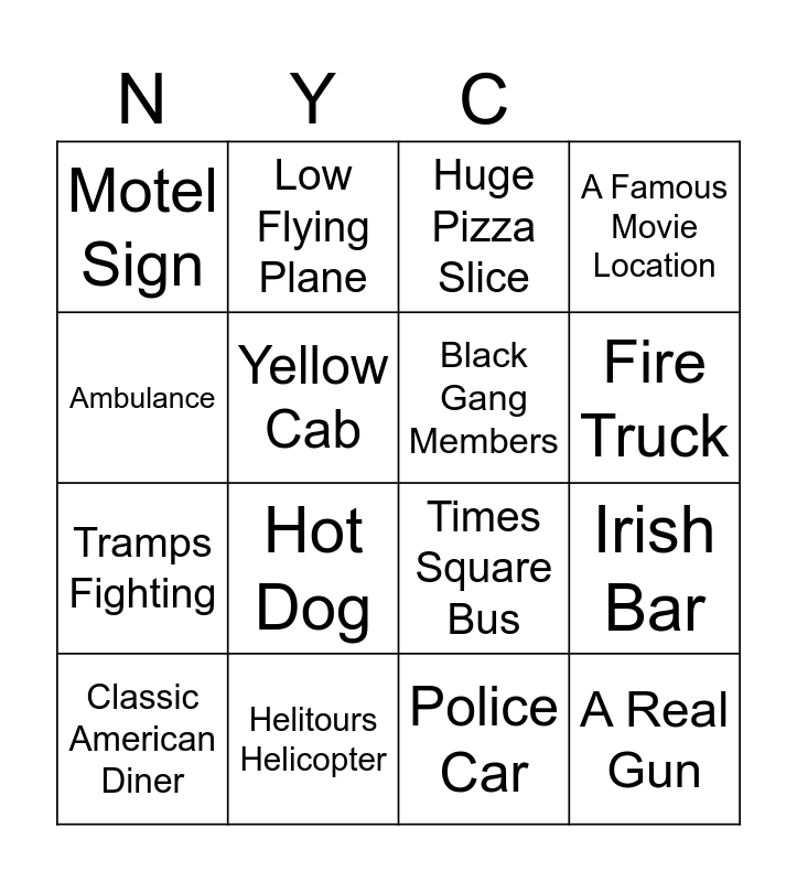 This bingo card has 16 words: Helitours Helicopter, Irish Bar, Huge Pizza Slice, Motel Sign, Tramps Fighting, Low Flying Plane, Times Square Bus, Police Car, Ambulance, Yellow Cab, Classic American Diner, A Famous Movie Location, Hot Dog, Fire Truck, Black Gang Members and A Real Gun.
