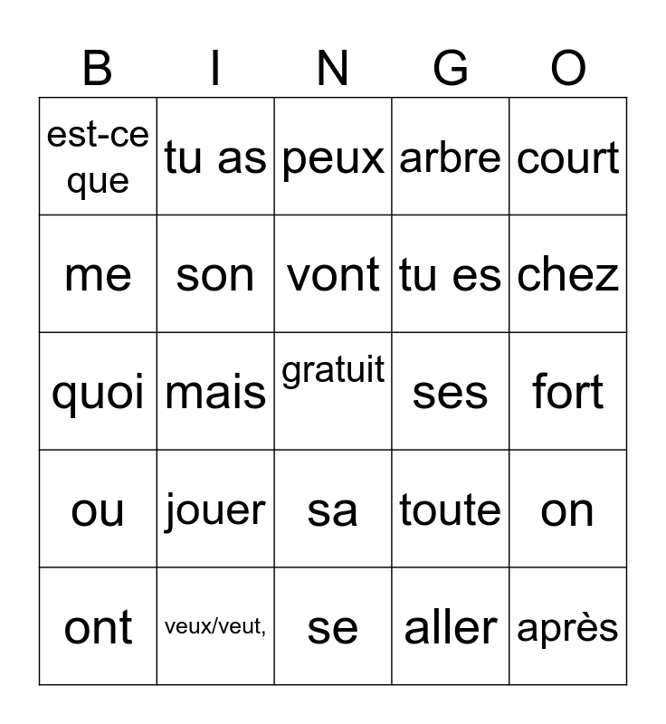 This bingo card has a free space and 30 words: veux/veut,, être, mais, c'est, est-ce que, peux, son, sa, ses, se, fort, après, aller, du, chez, tout, toute, ou, jouer, court, quoi, doit, tu as, tu es, me, arbre, on, ont, vont and sont.