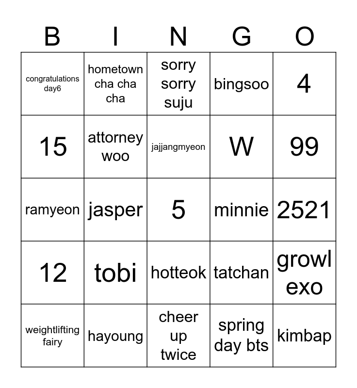 This bingo card has 25 words: tobi, cheer up twice, jajjangmyeon, weightlifting fairy, 4, congratulations day6, 15, hometown cha cha cha, minnie, hotteok, W, ramyeon, tatchan, growl exo, attorney woo, kimbap, 2521, sorry sorry suju, 99, jasper, 5, hayoung, 12, bingsoo and spring day bts.