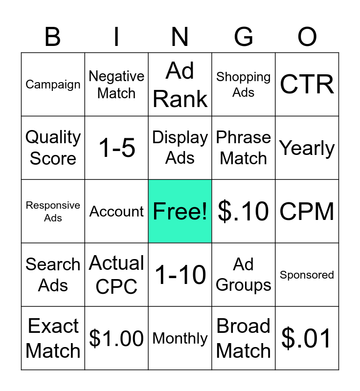 This bingo card has a free space and 24 words: Actual CPC, $1.00, Display Ads, Exact Match, CTR, Campaign, Quality Score, Negative Match, $.10, 1-10, Phrase Match, Responsive Ads, Ad Groups, Sponsored, 1-5, Broad Match, CPM, Ad Rank, Yearly, Account, $.01, Search Ads, Shopping Ads and Monthly.