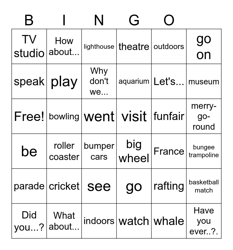 This bingo card has 36 words: go, see, watch, speak, be, visit, play, indoors, outdoors, rafting, museum, theatre, basketball match, bowling, aquarium, TV studio, parade, funfair, Free!, lighthouse, went, roller coaster, big wheel, bumper cars, France, How about..., Let's..., What about..., Why don't we..., go on, Have you ever..?., Did you...?, bungee trampoline, merry-go-round, cricket and whale.