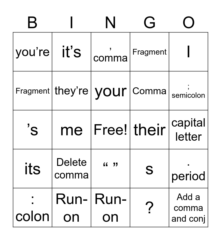 This bingo card has a free space and 24 words: Delete comma, Run-on, your, : colon, I, you’re, Fragment, it’s, their, “ ”, Comma, ’s, s, . period, they’re, ?, capital letter, , comma, ; semicolon, me, Add a comma and conj, its, Fragment and Run-on.