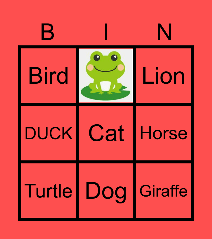 This bingo card has 1 images, a free space and 7 words: Horse, Lion, Turtle, Bird, Giraffe, DUCK and Dog.