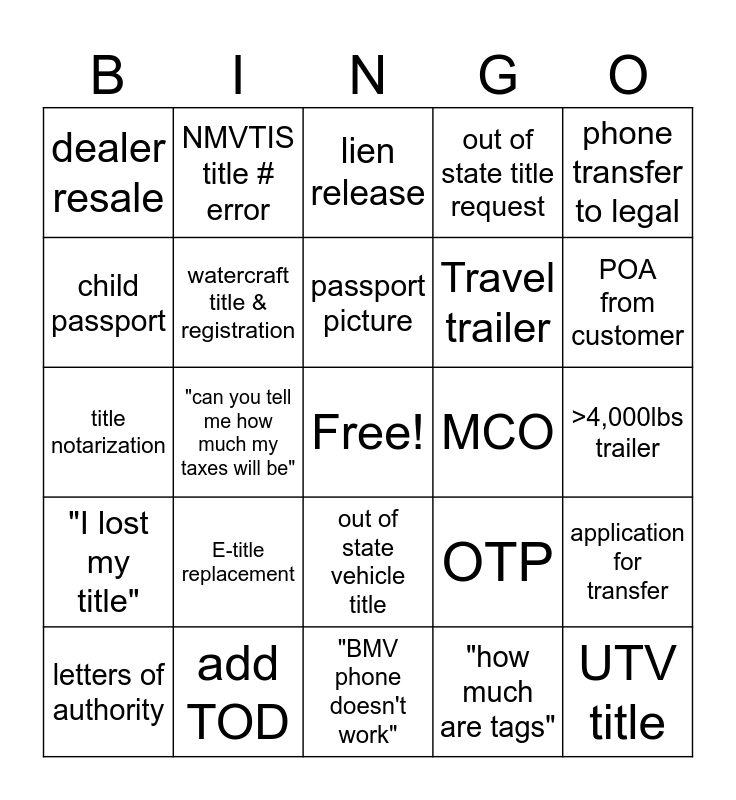 This bingo card has a free space and 35 words: traditional watercraft, alternative watercraft, watercraft transfer, watercraft title & registration, out of state vehicle title, out of state title request, child passport, adult passport, passport picture, 4+ passports, title notarization, phone transfer to legal, phone transfer to recorder, mobile home title, dealer resale, MCO, "how much are tags", "can you tell me how much my taxes will be", "I lost my title", UTV title, OTP, letters of authority, application for transfer, add TOD, lien release, POA from customer, turning a title salvage, salvage replacement, Travel trailer, >4,000lbs trailer, 5+ lien replacements, "BMV phone doesn't work", E-title replacement, NMVTIS title # error and out of state watercraft title.