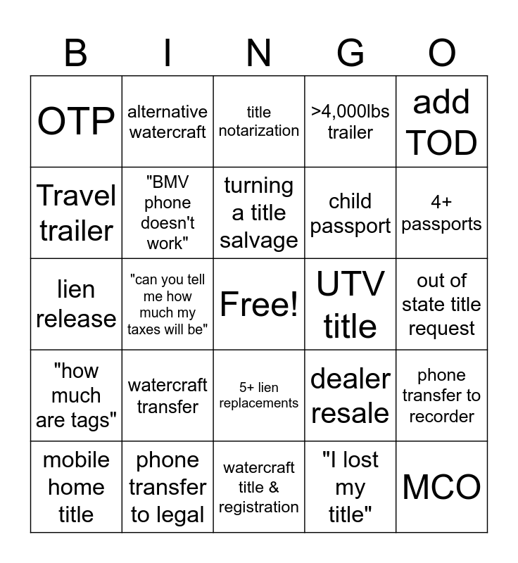 This bingo card has a free space and 35 words: out of state watercraft title, NMVTIS title # error, E-title replacement, "BMV phone doesn't work", 5+ lien replacements, >4,000lbs trailer, Travel trailer, salvage replacement, turning a title salvage, POA from customer, lien release, add TOD, application for transfer, letters of authority, OTP, UTV title, "I lost my title", "can you tell me how much my taxes will be", "how much are tags", MCO, dealer resale, mobile home title, phone transfer to recorder, phone transfer to legal, title notarization, 4+ passports, passport picture, adult passport, child passport, out of state title request, out of state vehicle title, watercraft title & registration, watercraft transfer, alternative watercraft and traditional watercraft.
