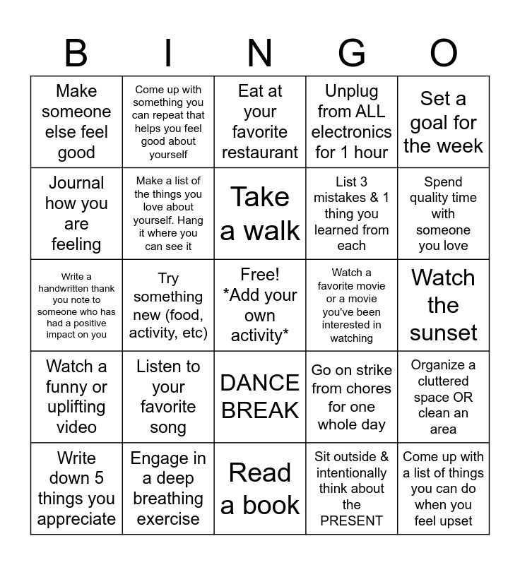 This bingo card has a free space and 24 words: Listen to your favorite song, Engage in a deep breathing exercise, Take a walk, Write down 5 things you appreciate, Set a goal for the week, Make someone else feel good, Journal how you are feeling, Come up with something you can repeat that helps you feel good about yourself, Watch a favorite movie or a movie you've been interested in watching, DANCE BREAK, List 3 mistakes & 1 thing you learned from each, Write a handwritten thank you note to someone who has had a positive impact on you, Go on strike from chores for one whole day, Organize a cluttered space OR clean an area, Make a list of the things you love about yourself. Hang it where you can see it, Sit outside & intentionally think about the PRESENT, Watch the sunset, Eat at your favorite restaurant, Spend quality time with someone you love, Try something new (food, activity, etc), Come up with a list of things you can do when you feel upset, Watch a funny or uplifting video, Unplug from ALL electronics for 1 hour and Read a book.