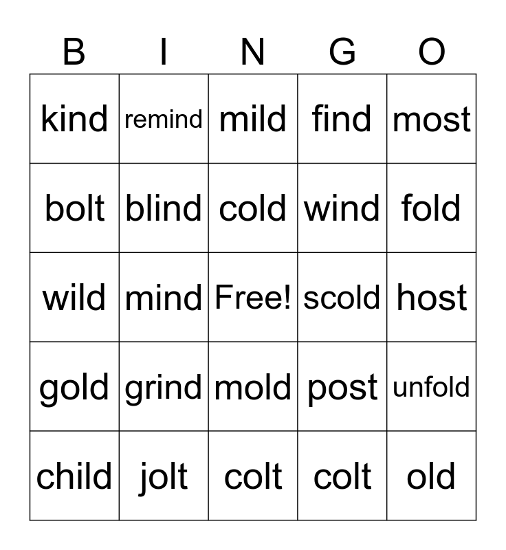 This bingo card has a free space and 24 words: child, grind, cold, colt, most, kind, remind, mild, scold, host, wild, blind, post, unfold, bolt, jolt, colt, find, fold, gold, mind, mold, wind and old.