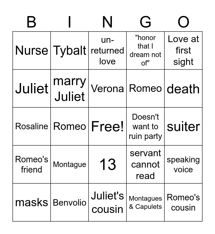 This bingo card has a free space and 24 words: Montague, Benvolio, Verona, masks, Love at first sight, Nurse, Juliet, Tybalt, Doesn't want to ruin party, 13, Romeo, Rosaline, servant cannot read, speaking voice, marry Juliet, Montagues & Capulets, suiter, un-returned love, death, Romeo, Romeo's cousin, Romeo's friend, "honor that I dream not of" and Juliet's cousin.