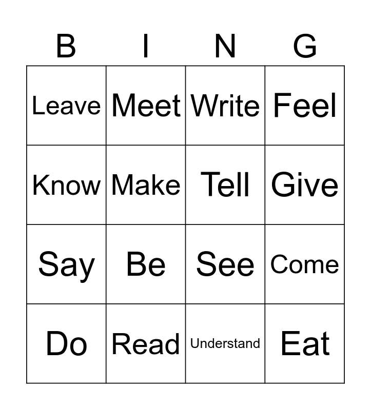 This bingo card has 25 words: Forget, Get, Give, Have, Know, Leave, Make, Meet, Read, Run, Say, See, Take, Teach, Tell, Think, Understand, Write, Be, Come, Do, Drink, Eat, Feel and Find.