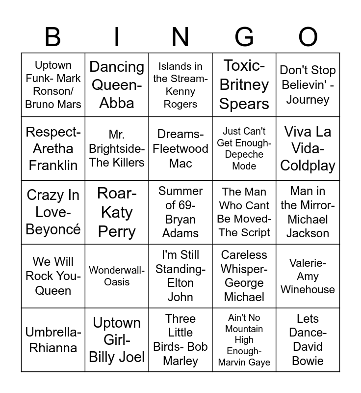 This bingo card has 25 words: Wonderwall- Oasis, Three Little Birds- Bob Marley, Dreams- Fleetwood Mac, Umbrella- Rhianna, Don't Stop Believin' - Journey, Uptown Funk- Mark Ronson/ Bruno Mars, Respect- Aretha Franklin, Dancing Queen- Abba, The Man Who Cant Be Moved-The Script, I'm Still Standing- Elton John, Just Can't Get Enough- Depeche Mode, Crazy In Love- Beyoncé, Careless Whisper- George Michael, Valerie- Amy Winehouse, Mr. Brightside- The Killers, Lets Dance- David Bowie, Man in the Mirror- Michael Jackson, Islands in the Stream- Kenny Rogers, Viva La Vida- Coldplay, Roar- Katy Perry, Summer of 69- Bryan Adams, Uptown Girl- Billy Joel, We Will Rock You- Queen, Toxic- Britney Spears and Ain't No Mountain High Enough- Marvin Gaye.