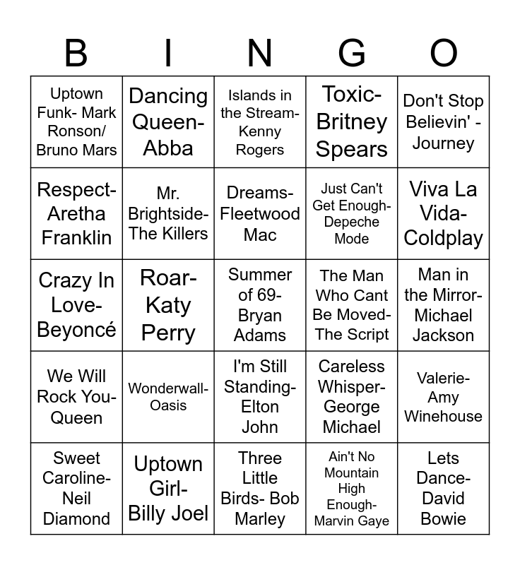 This bingo card has 25 words: Wonderwall- Oasis, Three Little Birds- Bob Marley, Dreams- Fleetwood Mac, Sweet Caroline- Neil Diamond, Don't Stop Believin' - Journey, Uptown Funk- Mark Ronson/ Bruno Mars, Respect- Aretha Franklin, Dancing Queen- Abba, The Man Who Cant Be Moved-The Script, I'm Still Standing- Elton John, Just Can't Get Enough- Depeche Mode, Crazy In Love- Beyoncé, Careless Whisper- George Michael, Valerie- Amy Winehouse, Mr. Brightside- The Killers, Lets Dance- David Bowie, Man in the Mirror- Michael Jackson, Islands in the Stream- Kenny Rogers, Viva La Vida- Coldplay, Roar- Katy Perry, Summer of 69- Bryan Adams, Uptown Girl- Billy Joel, We Will Rock You- Queen, Toxic- Britney Spears and Ain't No Mountain High Enough- Marvin Gaye.