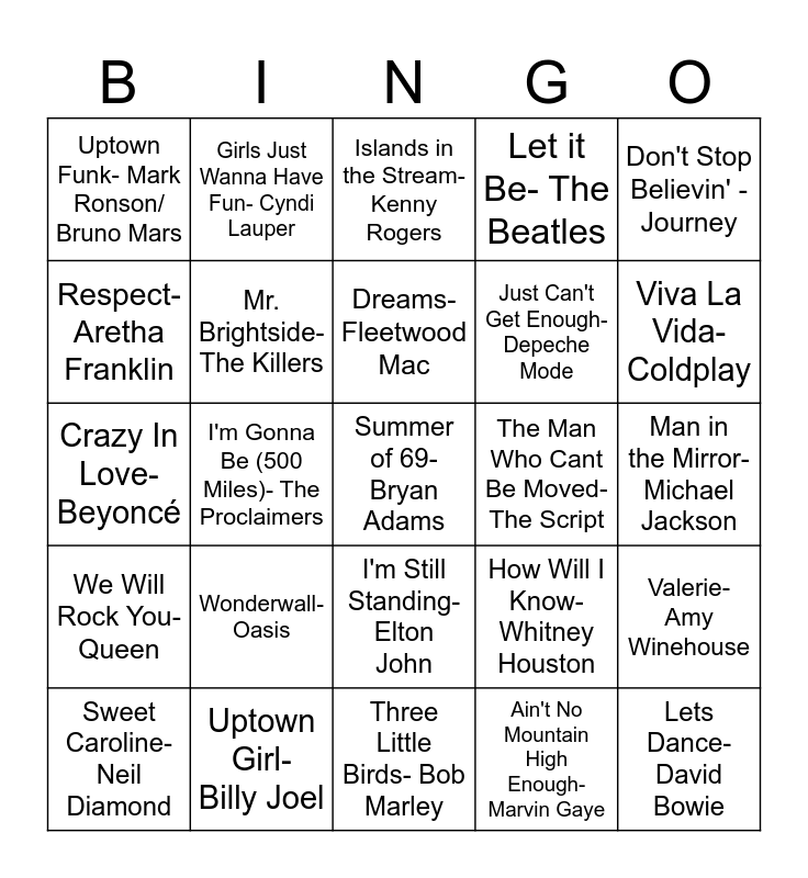 This bingo card has 25 words: Wonderwall- Oasis, Three Little Birds- Bob Marley, Dreams- Fleetwood Mac, Sweet Caroline- Neil Diamond, Don't Stop Believin' - Journey, Uptown Funk- Mark Ronson/ Bruno Mars, Respect- Aretha Franklin, Girls Just Wanna Have Fun- Cyndi Lauper, The Man Who Cant Be Moved-The Script, I'm Still Standing- Elton John, Just Can't Get Enough- Depeche Mode, Crazy In Love- Beyoncé, How Will I Know- Whitney Houston, Valerie- Amy Winehouse, Mr. Brightside- The Killers, Lets Dance- David Bowie, Man in the Mirror- Michael Jackson, Islands in the Stream- Kenny Rogers, Viva La Vida- Coldplay, I'm Gonna Be (500 Miles)- The Proclaimers, Summer of 69- Bryan Adams, Uptown Girl- Billy Joel, We Will Rock You- Queen, Let it Be- The Beatles and Ain't No Mountain High Enough- Marvin Gaye.