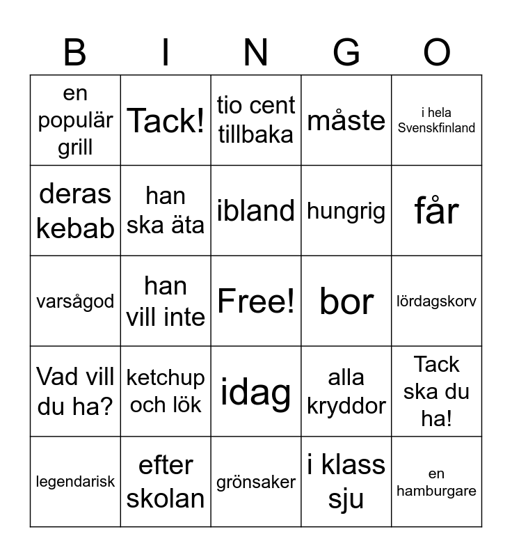 This bingo card has a free space and 24 words: ketchup och lök, efter skolan, ibland, legendarisk, i hela Svenskfinland, en populär grill, deras kebab, Tack!, bor, idag, hungrig, varsågod, alla kryddor, Tack ska du ha!, han ska äta, i klass sju, lördagskorv, tio cent tillbaka, får, han vill inte, en hamburgare, Vad vill du ha?, måste and grönsaker.