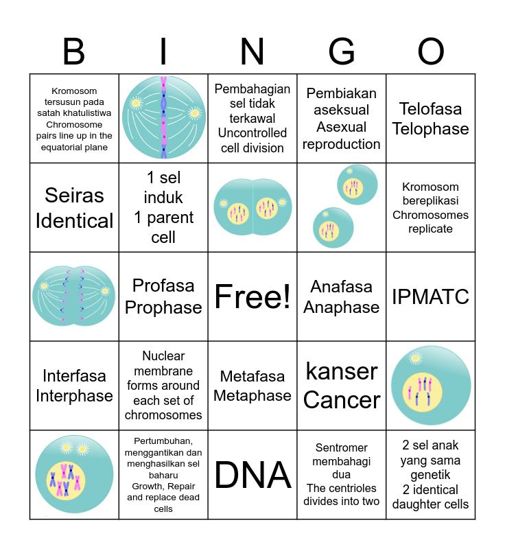 This bingo card has 6 images, a free space and 19 words: Nuclear membrane forms around each set of chromosomes, Sentromer membahagi dua The centrioles divides into two, Kromosom bereplikasi Chromosomes replicate, Kromosom tersusun pada satah khatulistiwa Chromosome pairs line up in the equatorial plane, Pembahagian sel tidak terkawal Uncontrolled cell division, 1 sel induk 1 parent cell, kanser Cancer, 2 sel anak yang sama genetik 2 identical daughter cells, Seiras Identical, Pertumbuhan, menggantikan dan menghasilkan sel baharu Growth, Repair and replace dead cells, DNA, Pembiakan aseksual Asexual reproduction, IPMATC, Interfasa Interphase, Profasa Prophase, Metafasa Metaphase, Anafasa Anaphase, Telofasa Telophase and Cytokinesis.