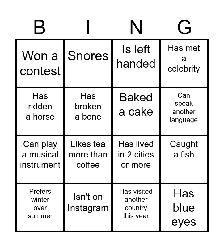This bingo card has 16 words: Isn't on Instagram, Caught a fish, Is left handed, Won a contest, Can play a musical instrument, Snores, Has lived in 2 cities or more, Has visited another country this year, Has ridden a horse, Has broken a bone, Prefers winter over summer, Has met a celebrity, Likes tea more than coffee, Can speak another language, Baked a cake and Has blue eyes.