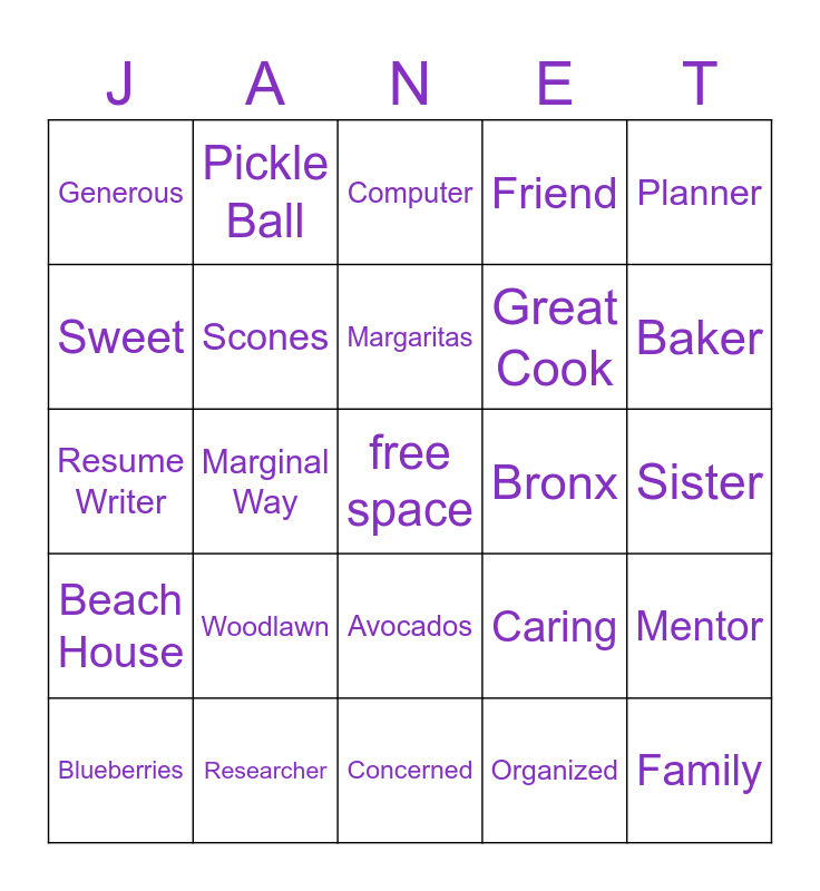 This bingo card has a free space and 39 words: Taco Bar, Tortillas, Driveway Drinking, Scones, Blueberries, Avocados, Margaritas, Clear Ice, Planner, Beach House, Marginal Way, Friend, Family, Sister, Bronx, Woodlawn, St. Barnabas, Generous, Loving, Caring, Sweet, Concerned, Great Cook, Baker, Pizza, Pasta, Travel, Italy, Eclipse, Pickle Ball, Mahjong, Canasta, Computer, Researcher, Organized, Teacher, Mentor, Resume Writer and Ossining.