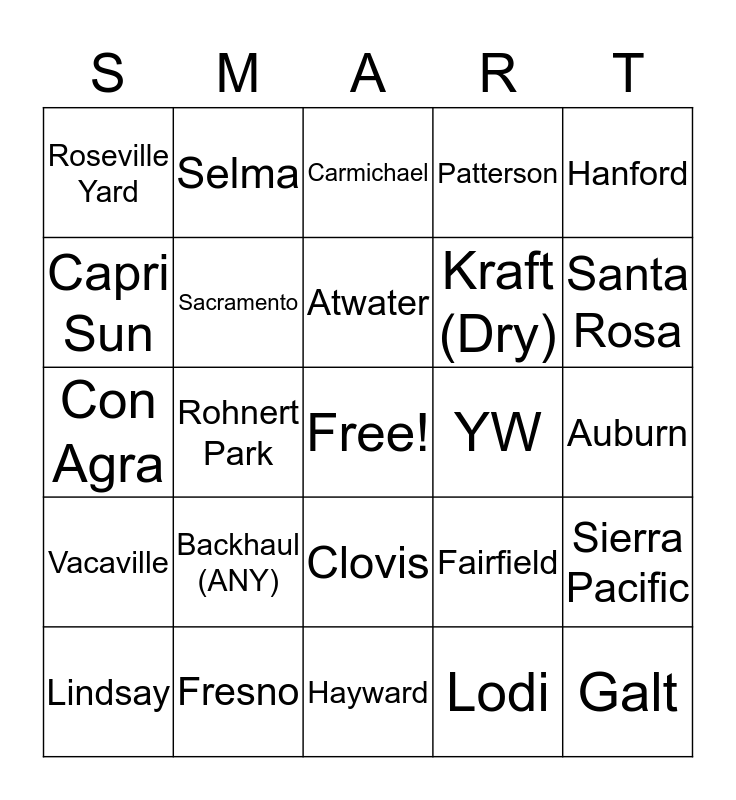 This bingo card has a free space and 24 words: Backhaul (ANY), Fresno, Atwater, Lindsay, Hanford, Roseville Yard, Capri Sun, Selma, YW, Clovis, Kraft (Dry), Con Agra, Fairfield, Sierra Pacific, Sacramento, Lodi, Auburn, Carmichael, Santa Rosa, Rohnert Park, Galt, Vacaville, Patterson and Hayward.
