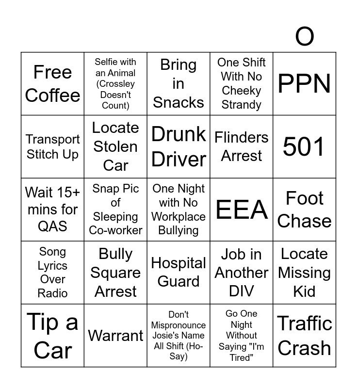 This bingo card has a free space and 24 words: Bully Square Arrest, Warrant, Drunk Driver, Tip a Car, PPN, Free Coffee, Transport Stitch Up, Selfie with an Animal (Crossley Doesn't Count), EEA, Hospital Guard, Flinders Arrest, Wait 15+ mins for QAS, Job in Another DIV, Locate Missing Kid, Locate Stolen Car, Go One Night Without Saying "I'm Tired", Foot Chase, Bring in Snacks, 501, Snap Pic of Sleeping Co-worker, Traffic Crash, Song Lyrics Over Radio, One Shift With No Cheeky Strandy and Don't Mispronounce Josie's Name All Shift (Ho-Say).