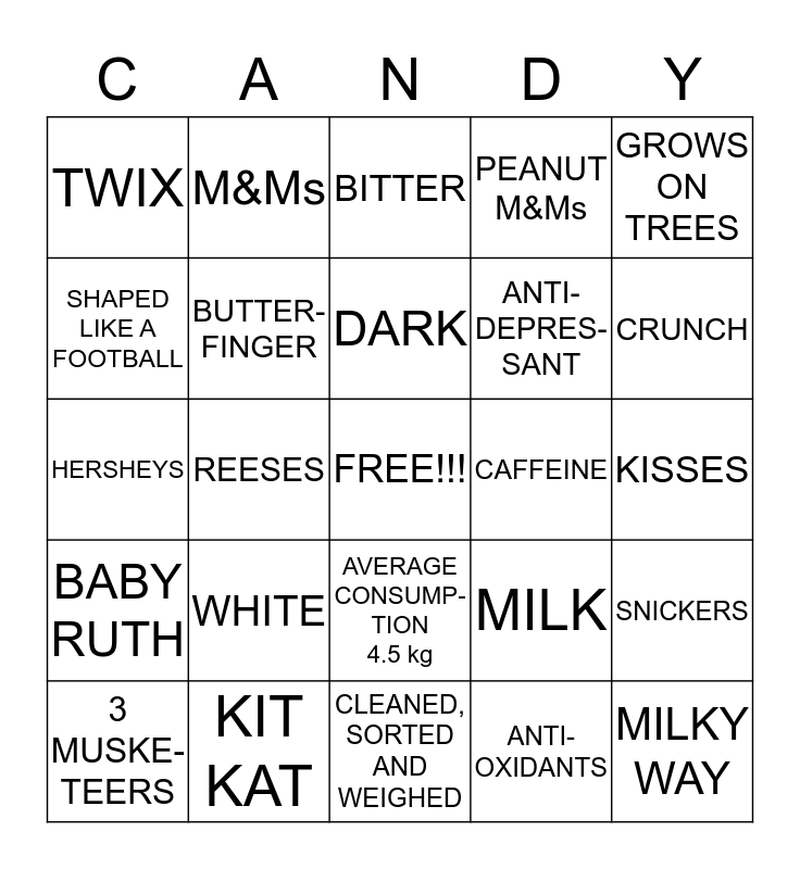 This bingo card has a free space and 24 words: WHITE, KIT KAT, DARK, 3 MUSKE-TEERS, GROWS ON TREES, TWIX, SHAPED LIKE A FOOTBALL, M&Ms, CAFFEINE, AVERAGE CONSUMP-TION 4.5 kg, ANTI- DEPRES-SANT, HERSHEYS, MILK, SNICKERS, BUTTER- FINGER, ANTI-OXIDANTS, KISSES, BITTER, CRUNCH, REESES, MILKY WAY, BABY RUTH, PEANUT M&Ms and CLEANED, SORTED AND WEIGHED.