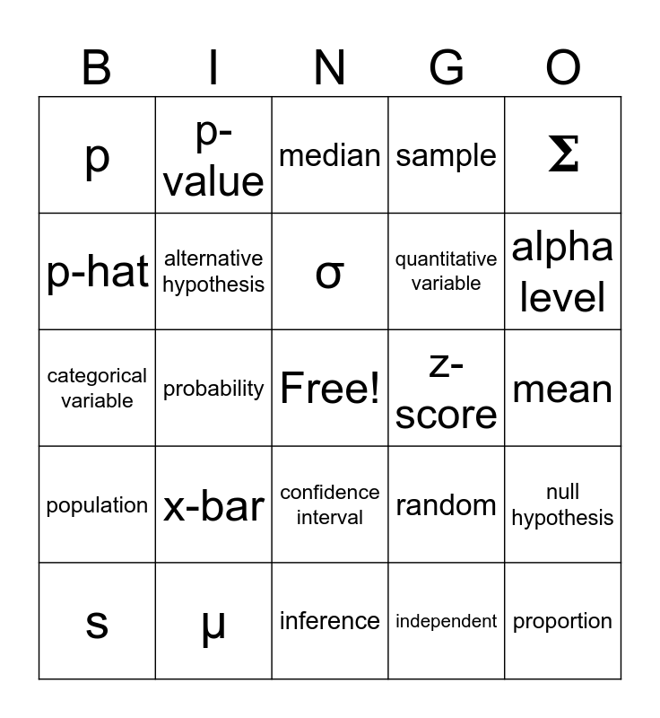 This bingo card has a free space and 24 words: x-bar, μ, σ, s, 𝚺, p, p-hat, p-value, z-score, confidence interval, quantitative variable, categorical variable, random, null hypothesis, alternative hypothesis, independent, mean, median, alpha level, probability, proportion, population, sample and inference.