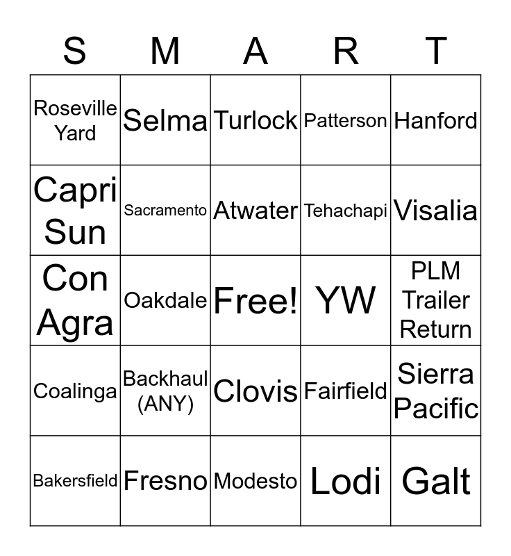 This bingo card has a free space and 24 words: Backhaul (ANY), Fresno, Atwater, Bakersfield, Hanford, Roseville Yard, Capri Sun, Selma, YW, Clovis, Tehachapi, Con Agra, Fairfield, Sierra Pacific, Sacramento, Lodi, PLM Trailer Return, Turlock, Visalia, Oakdale, Galt, Coalinga, Patterson and Modesto.