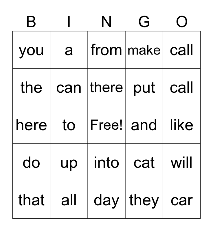 This bingo card has a free space and 24 words: up, all, there, that, call, you, the, a, and, into, put, here, cat, will, can, they, like, from, call, to, car, do, make and day.