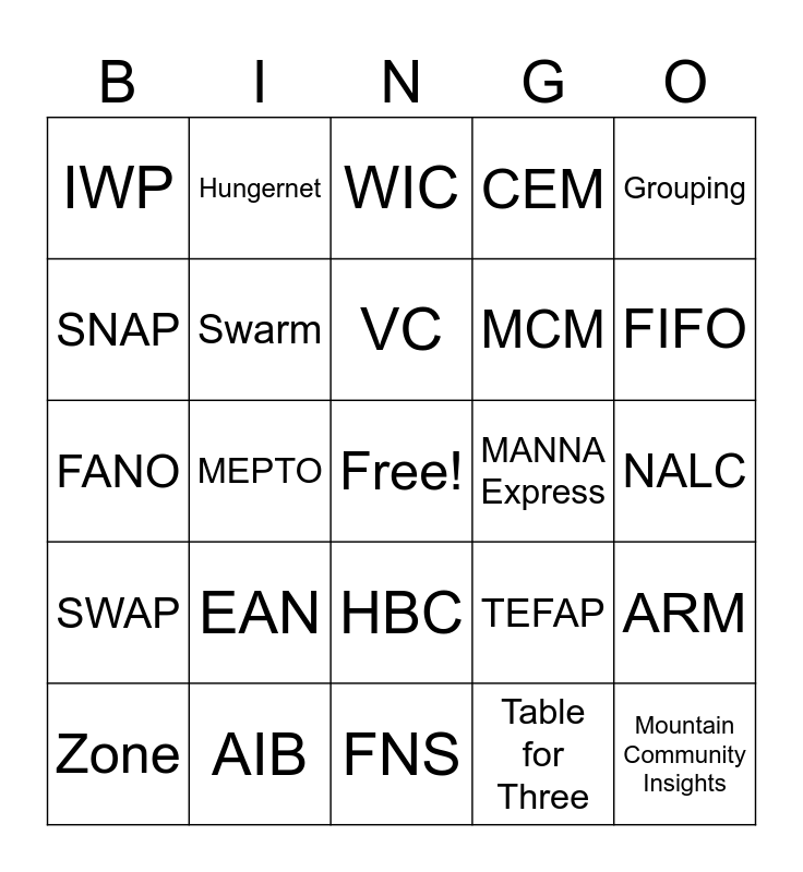 This bingo card has a free space and 27 words: TEFAP, CERVIS, MCM, FNS, SNAP, WIC, Hungernet, SWAP, MANNA Express, ARM, FANO, CEM, Zone, AIB, FIFO, Shared Maintenance, Swarm, VC, EAN, IWP, NALC, Table for Three, MEPTO, Mountain Community Insights, HBC, Grouping and FTC.