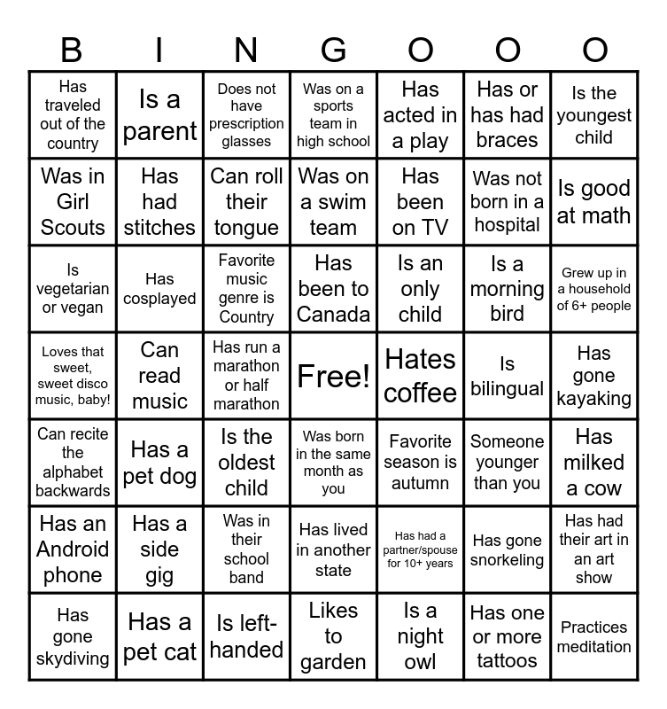 This bingo card has a free space and 56 words: Has one or more tattoos, Grew up in a household of 6+ people, Has more than 2 siblings, Has traveled out of the country, Can read music, Was in their school band, Is the youngest child, Has gotten a speeding ticket, Has had stitches, Has lived in another state, Was on a sports team in high school, Has an Android phone, Can recite the alphabet backwards, Has gone kayaking, Has a pet cat, Has a pet dog, Has acted in a play, Has been on TV, Can dance the Macarena, Was not born in a hospital, Is good at math, Is the oldest child, Is an only child, Does not have prescription glasses, Was in Boy Scouts, Was in Girl Scouts, Is bilingual, Knows the chicken dance, Can roll their tongue, Was born in the same month as you, Shares a star sign (zodiac) with you, Has milked a cow, Has gone skydiving, Is left-handed, Is vegetarian or vegan, Has or has had braces, Was on a swim team, Has a side gig, Has cosplayed, Is a parent, Has been to Canada, Practices meditation, Has had a partner/spouse for 10+ years, Has seen the same artist in concert 3+ times, Has had their art in an art show, Favorite music genre is Country, Loves that sweet, sweet disco music, baby!, Likes to garden, Someone younger than you, Hates coffee, Has run a marathon or half marathon, Favorite season is autumn, Has gone snorkeling, Is a night owl, Is a morning bird and Believes pineapple belongs on pizza.
