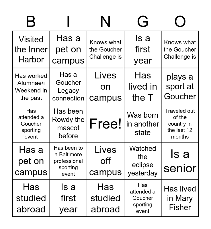 This bingo card has a free space and 48 words: Has lived in the T, Has lived in Mary Fisher, plays a sport at Goucher, Has studied abroad, Has been to a Baltimore professional sporting event, Lives off campus, Has a pet on campus, Has traveled to Europe, Has worked Alumnae/i Weekend in the past, Has been to Pasta Mista in Towson, Has a Goucher Legacy connection, Is a first year, Is a senior, Watched the eclipse yesterday, Traveled out of the country in the last 12 months, Is wearing school colors today, Lives on campus, Was born in another state, involved in student government, Knows what the Goucher Challenge is, Has been Rowdy the mascot before, Has attended a Goucher sporting event, Visited the Inner Harbor, Has lived in the T, Has lived in Mary Fisher, plays a sport at Goucher, Has studied abroad, Has been to a Baltimore professional sporting event, Lives off campus, Has a pet on campus, Has traveled to Europe, Has worked Alumnae/i Weekend in the past, Has been to Pasta Mista in Towson, Has a Goucher Legacy connection, Is a first year, Is a senior, Watched the eclipse yesterday, Traveled out of the country in the last 12 months, Is wearing school colors today, Lives on campus, Was born in another state, involved in student government, Knows what the Goucher Challenge is, Has been Rowdy the mascot before, Has attended a Goucher sporting event, Visited the Inner Harbor, Has lived in the T and Has attended the Jewell Robinson Dinner.