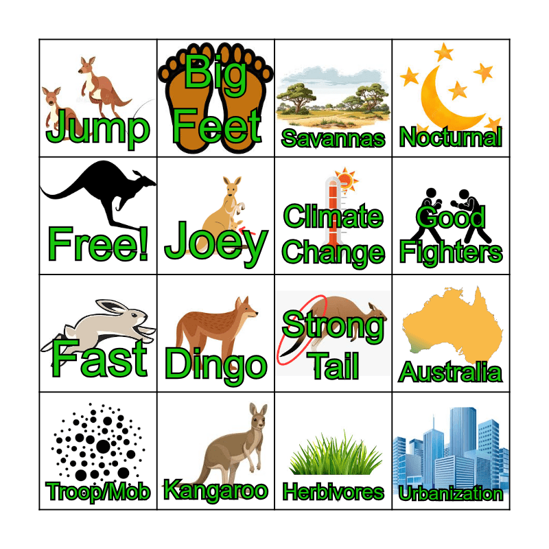 This bingo card has 16 images and 16 words: Kangaroo, Australia, Savannas, Jump, Fast, Big Feet, Strong Tail, Herbivores, Free!, Joey, Troop/Mob, Nocturnal, Dingo, Good Fighters, Climate Change and Urbanization.