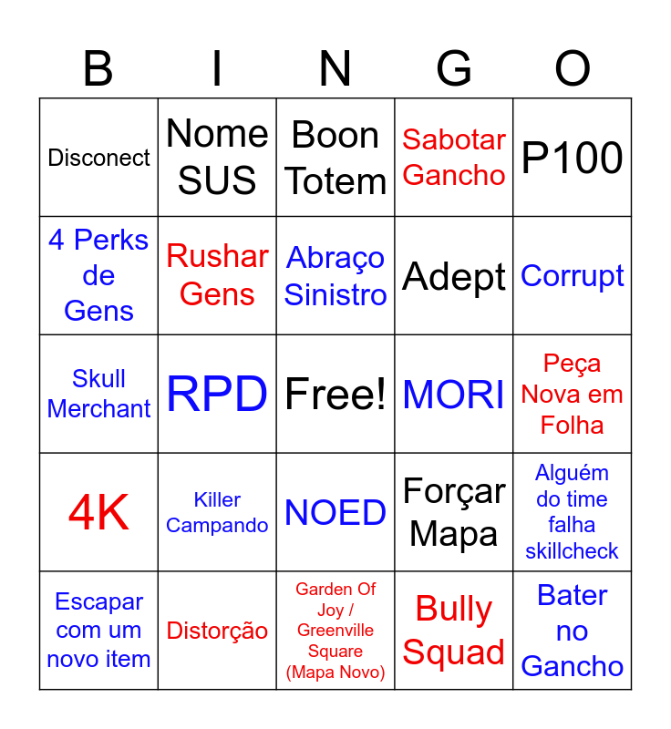 This bingo card has a free space and 24 words: Killer Campando, Distorção, Abraço Sinistro, Escapar com um novo item, P100, Disconect, 4 Perks de Gens, Nome SUS, MORI, NOED, Adept, Skull Merchant, Forçar Mapa, Alguém do time falha skillcheck, Rushar Gens, Bully Squad, Peça Nova em Folha, Boon Totem, Corrupt, RPD, Bater no Gancho, 4K, Sabotar Gancho and Garden Of Joy / Greenville Square (Mapa Novo).