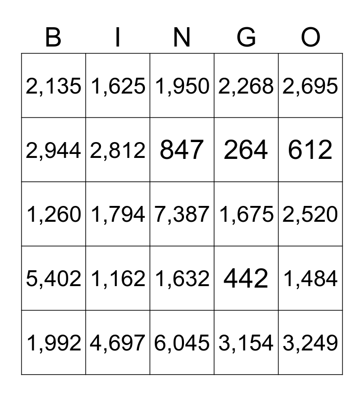 This bingo card has 25 words: 1,162, 6,045, 847, 1,992, 2,695, 2,135, 2,944, 1,625, 1,675, 1,632, 264, 1,260, 442, 1,484, 2,812, 3,249, 2,520, 1,950, 612, 1,794, 7,387, 4,697, 5,402, 2,268 and 3,154.