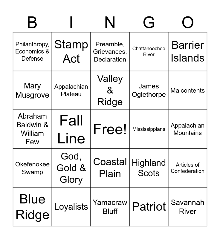 This bingo card has a free space and 39 words: Northern & Western, Southern & Eastern, North America, Appalachian Plateau, Blue Ridge, Coastal Plain, Valley & Ridge, Piedmont, Barrier Islands, Okefenokee Swamp, Fall Line, Chattahoochee River, Savannah River, Appalachian Mountains, Mississippians, God, Gold & Glory, Charter of 1732, Philanthropy, Economics & Defense, Savannah, Highland Scots, Mary Musgrove, Yamacraw Bluff, James Oglethorpe, Malcontents, Salzburgers, Trustee Period, Royal Period, French & Indian War, Proclamation of 1763, Stamp Act, Declaration of Independence, Button Gwinnett, Lyman Hall, & George Walton, Preamble, Grievances, Declaration, Loyalists, Patriot, Siege of Savannah, Articles of Confederation, Abraham Baldwin & William Few and U.S. Constitution.