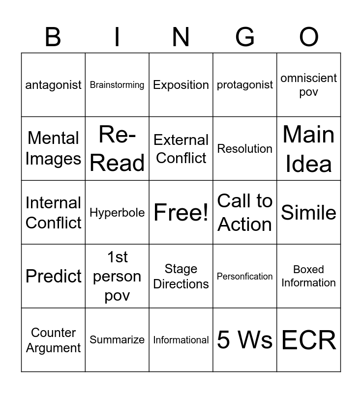This bingo card has a free space and 78 words: Text evidence, plot, Exposition, Hook, rising action, climax, falling action, Rhyme, Flat Character, Round Character, static character, dynamic character, protagonist, antagonist, Text Features, Mental Images, mood, 1st person pov, Theme, Simile, limited 3rd person pov, omniscient pov, Internal Conflict, External Conflict, Re-Read, symbolism, irony, flashback, foreshadowing, Author's Purpose, Main Idea, Literary Non-Fiction, Informational, Argumentative, Counter Argument, Call to Action, Thesis, ACE, SCR, ECR, Topic Sentence, Tie Back Sentence, Audience, Tone, Planning, Brainstorming, Rough Draft, Essay Structure, Chronological, Anecdote, Boxed Information, Hyperbole, Personfication, Graphic Features, Metaphor, Onomatopoeia, Poetry, Prose, Drama, Stage Directions, Resolution, Dialogue, Infer, Stanza, Line Break, Body Paragraph, Transition Words, Transition Phrases, Predict, Summarize, Analyze, Characterization, Process of Elimination, #Summary, 5 Ws, Comma Splice, ,fanboys and demonstrate.