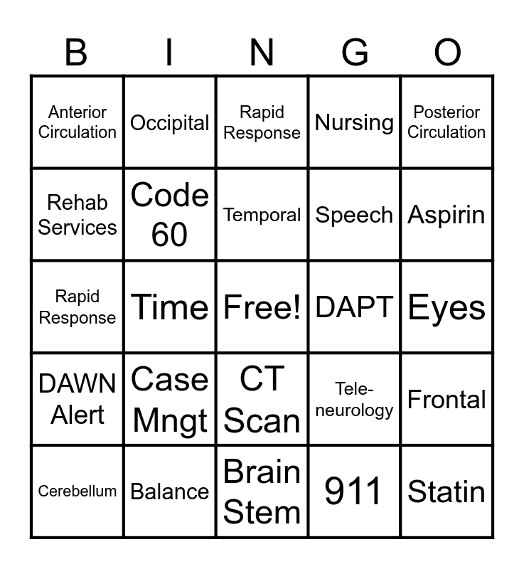 This bingo card has a free space and 29 words: Cerebellum, TNKase, Time, BEFAST, Anterior Circulation, Rapid Response, Code 60, Case Mngt, DAPT, Balance, Eyes, Statin, Brain Stem, 911, Aspirin, Face, CT Scan, DAWN Alert, Posterior Circulation, Rapid Response, Tele- neurology, Arms, Speech, Rehab Services, Nursing, Occipital, Frontal, Temporal and Parietal.