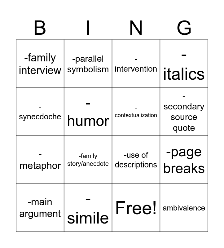 This bingo card has 17 words: Free!, -main argument, -intervention, -family interview, -family story/anecdote, -italics, -page breaks, -contextualization, -secondary source quote, -humor, -simile, -use of descriptions, -synecdoche, -parallel symbolism, -metaphor, -rhetorical question and ambivalence.