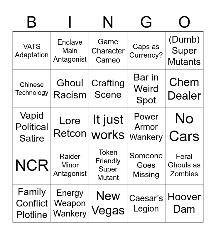 This bingo card has a free space and 33 words: Ron Perlman, War Never Changes, Lore Retcon, Dog Companion, NCR, Ghoul Racism, (Dumb) Super Mutants, Family Conflict Plotline, Enclave Main Antagonist, Excess of 50s Music, Crafting Scene, Game Character Cameo, Robot Comedic Relief, Gross Wasteland Food, Power Armor Wankery, Chem Dealer, Energy Weapon Wankery, Vapid Political Satire, Raider Minor Antagonist, Someone Goes Missing, Token Friendly Super Mutant, Communism Mentioned, VATS Adaptation, No Cars, New Vegas, Hoover Dam, Caps as Currency?, Bar in Weird Spot, Chinese Technology, Feral Ghouls as Zombies, Canon Ending to Fallout 4, Caesar’s Legion and “What Makes You SPECIAL?”.
