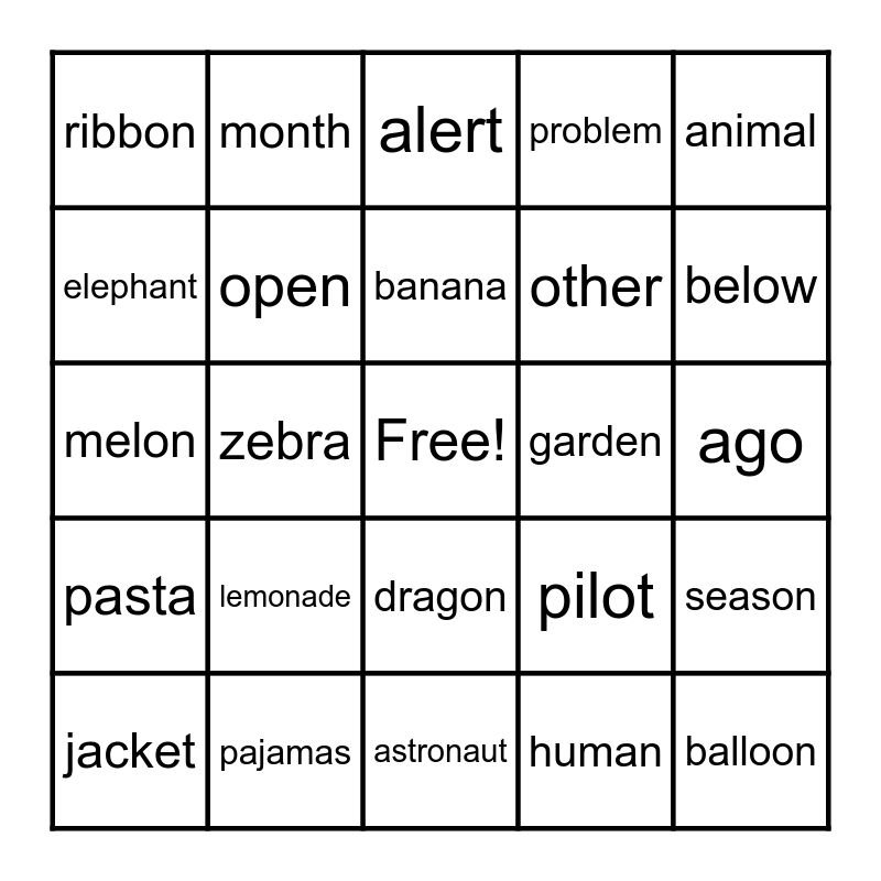 This bingo card has a free space and 24 words: lemonade, pajamas, banana, jacket, animal, ribbon, elephant, month, garden, dragon, other, melon, pilot, season, open, human, ago, alert, below, zebra, balloon, pasta, problem and astronaut.