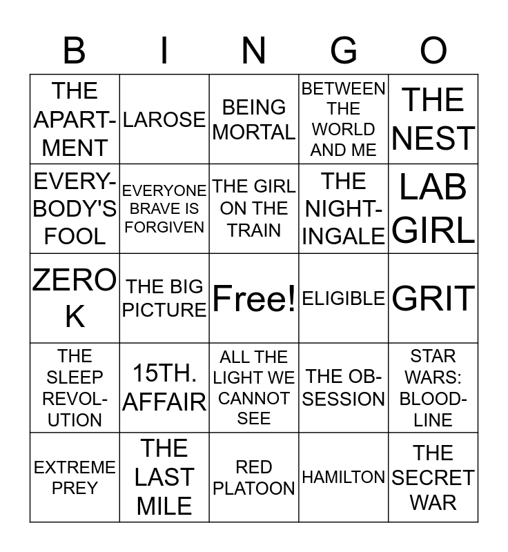 This bingo card has a free space and 24 words: 15TH. AFFAIR, THE LAST MILE, THE GIRL ON THE TRAIN, EXTREME PREY, THE NEST, THE APART-MENT, EVERY- BODY'S FOOL, LAROSE, ELIGIBLE, ALL THE LIGHT WE CANNOT SEE, THE NIGHT-INGALE, ZERO K, THE OB-SESSION, STAR WARS: BLOOD-LINE, EVERYONE BRAVE IS FORGIVEN, HAMILTON, GRIT, BEING MORTAL, LAB GIRL, THE BIG PICTURE, THE SECRET WAR, THE SLEEP REVOL- UTION, BETWEEN THE WORLD AND ME and RED PLATOON.